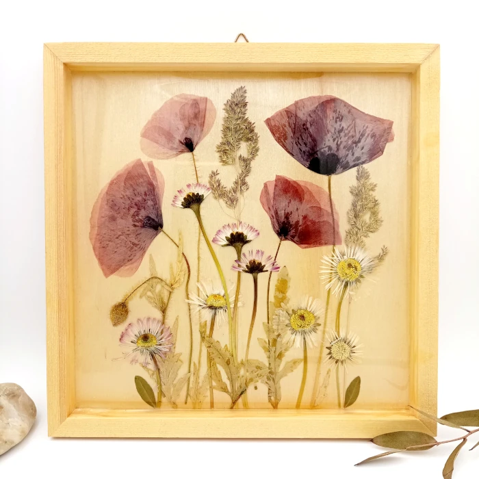 Obrázok vytvorený v drevenom ráme (povôdne vyšívacom), v ktorom sú živicou zaliate skutočné kvety z lúky a poľa