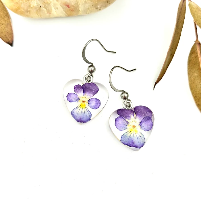 Krásne náušničky, ktoré sú vytvorené z ozajstných fialiek / malých sirôtok, ktoré sú zaliate v živici v lôžkach z chirurgickej ocele na zatváracích ozdobných háčikoch