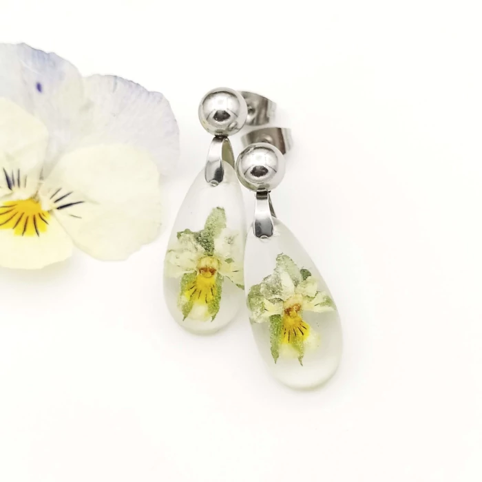Krásne náušničky, ktoré sú vytvorené z ozajstných sušených kvetov (gypsomilka a kufea), vyrábané v niekoľkých vrstvách niekoľko dní, v oceľovom rámčeku v tvare slzičky, sú isto jedinečné a na ušku krásne vyniknú :)