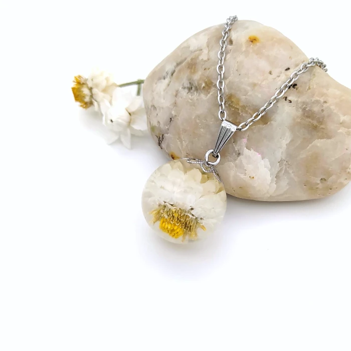 Milý živicový šperk v tvare guľôčky so skutočným kvietkom piesočníka (z Liptova) na oceľovej retiazke s karabínkou.