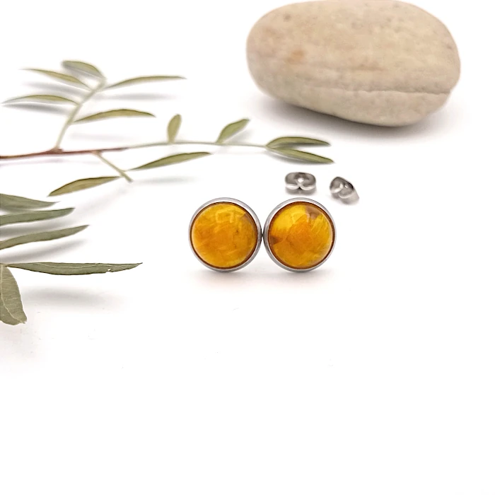 Jemné, ženské puzetové náušnice (tzv. napichovačky), ktoré hrajú jesennými farbami od žltej, cez oranžovú až po červenú - vznikli z lupienkov skutočných kvetov aksamietnice, ktoré sú zaliate živicou v oválnych oceľových lôžkach.