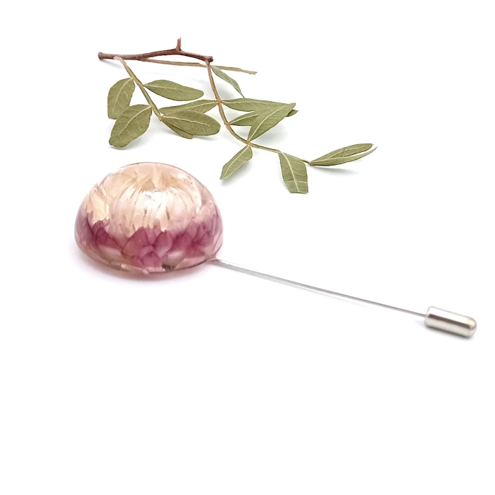 Zaujímavým doplnkom vášej blúzky alebo saka, či ozdobou na svetríku bude táto originálna brošňa so skutočnými rastlinkami, ktoré sú zaliate v čírej živici, zo spodnej strany v bielej, aby lepšie vynikli farby.