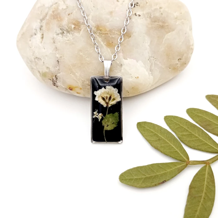 Skvostný jemný prívesok, v ktorom sú ozajstné kvietky zaliate živicou v oceľovom lôžku, zo spodnej strany čiernou, čím dostal tento kúsok svoj dynamický ráz.