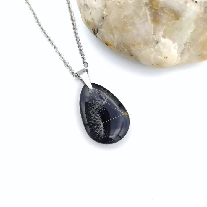 "Padáčiky" púpavy s čiernym pozadím (aby vynikli nakoľko sú jemnulinké) tvoria krásny, jemný prívesok na oceľovej retiazke