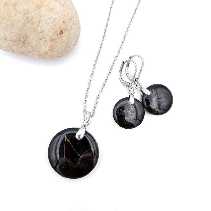 Krásna minimalistická, vďaka svojej čiernej farbe dostatočne výrazná súprava náučníc s náhrdelníkom s jemnučkými "padáčikmi" púpavy.