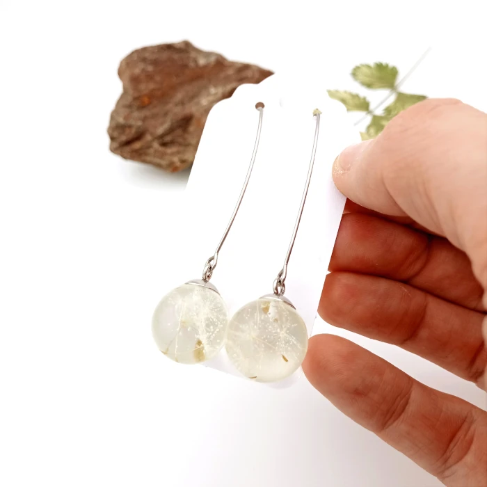 Krásne, veľmi elegantné, dlhé visiace náušničky s padáčikmi púpavy (skutočné semienka), ktoré sú zaliate v živici.