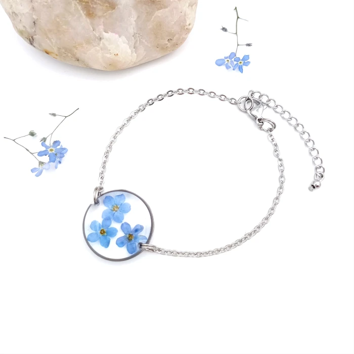 Skutočné nezábudky, ktoré sú zaliate v tenkom oceľovom ráme živicou a pripevnené na retiazku s karabínkou.