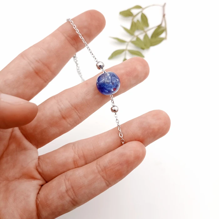 Veľmi elegantný, tenučký retiazkový náramok, na ktorom je navlečená malá guľôčka, ktorá vznikla zo skutočného lišajníka / kvietku ružovej limonky / lupienkov nevädze a živice.