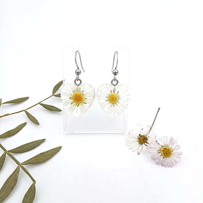 Ozajstné sedmokrásky na vaše ušká. Srdiečkové visačky vznikli zaliatim kvietkov živicou.