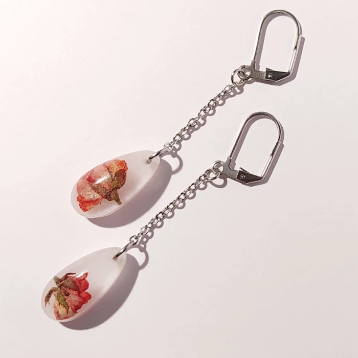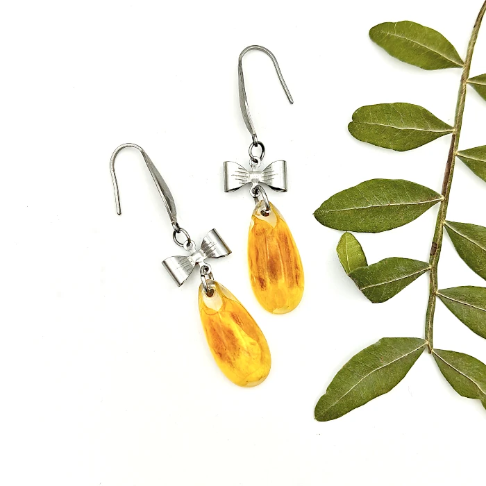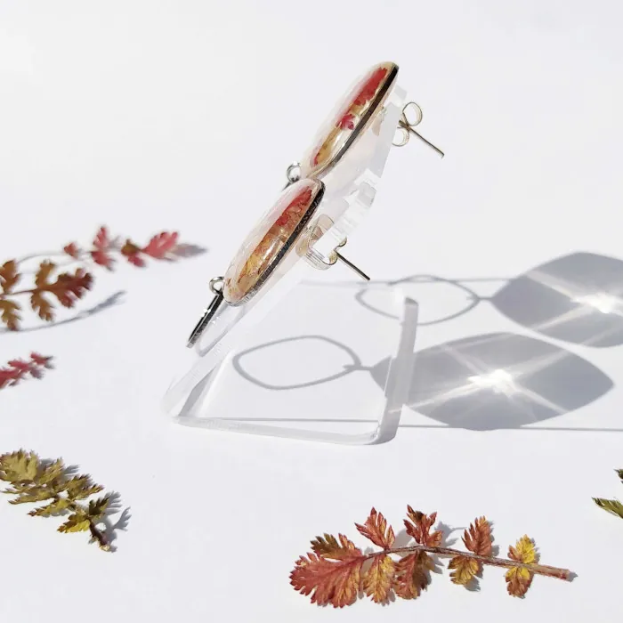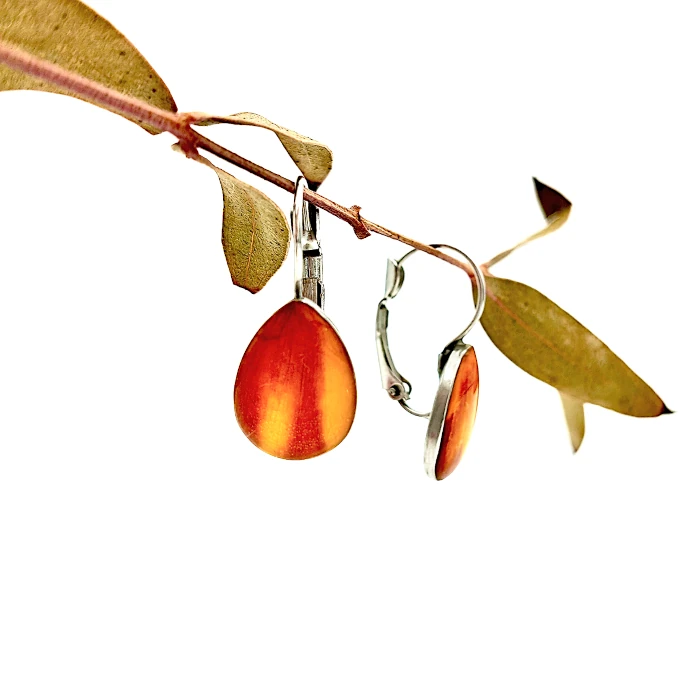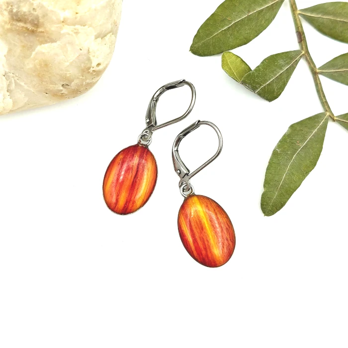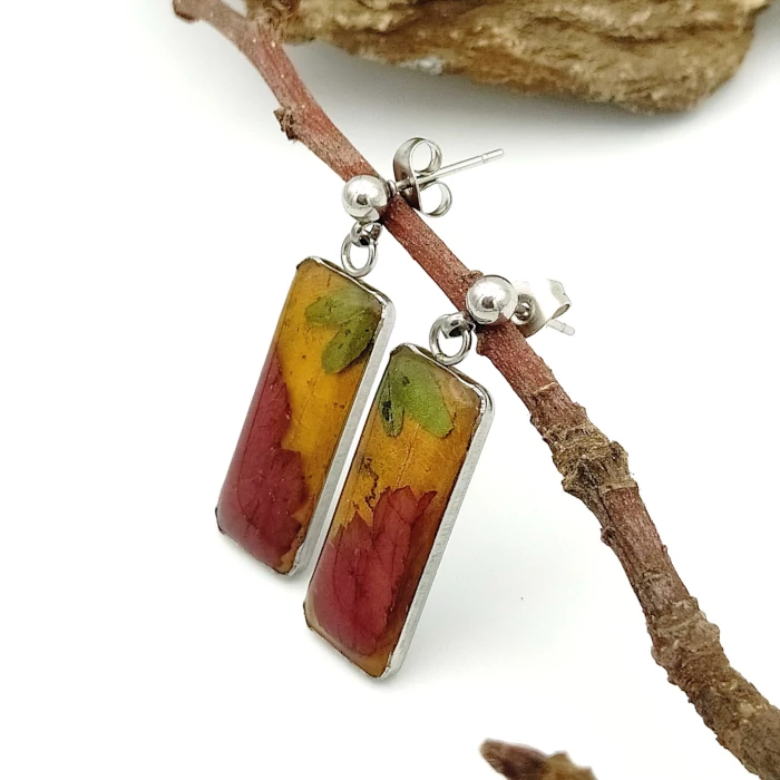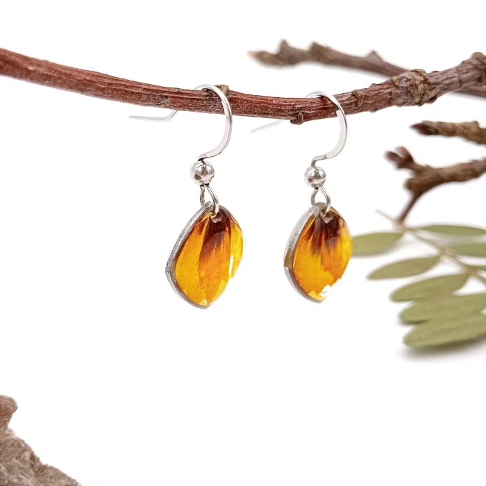 Zatváracie visiace náušnice, jemné, ženské, hrajú jesennými farbami od žltej, cez oranžovú až po červenú - vznikli z lupienkov skutočných kvetov aksamietnice, ktoré sú zaliate živicou v slzičkových náušnicových lôžkach.