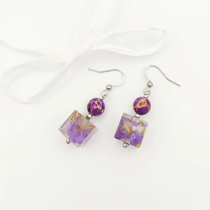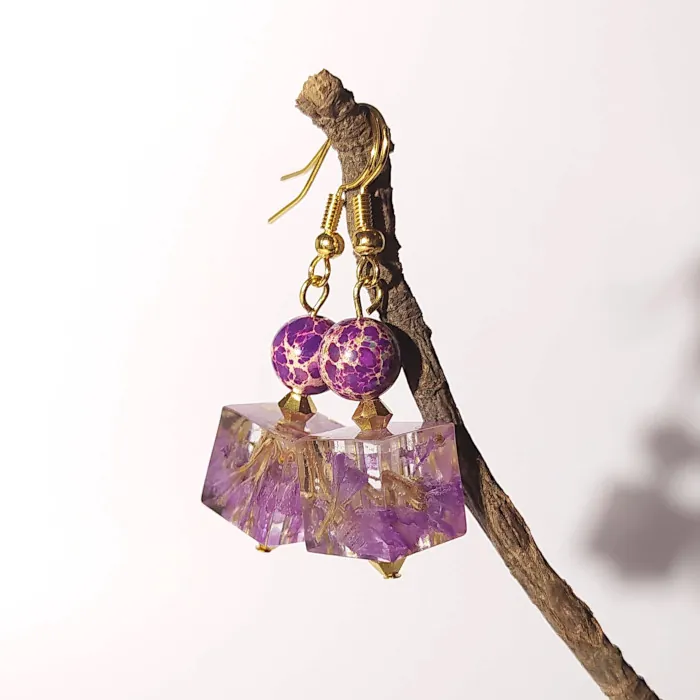 Visiace náušnice s živicovými kockami fialovej limonky doplnené regalitom