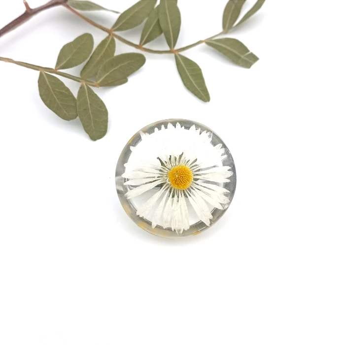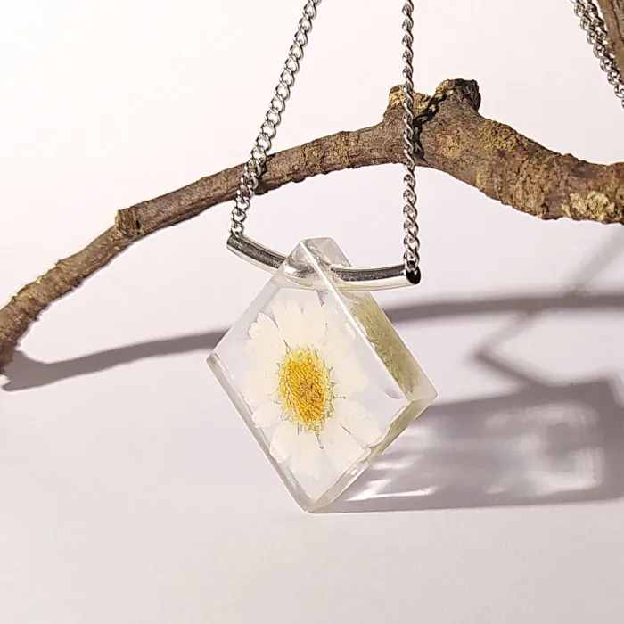 Krásny jarný živicový šperk - zaliata margarétka v čírej živici pôsobí akoby bolia zamrznutá v "kocke" ľadu :)
