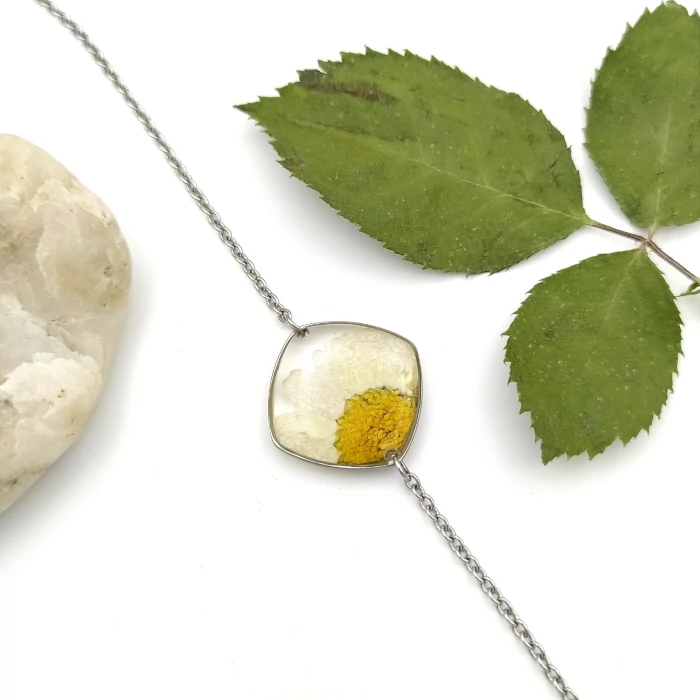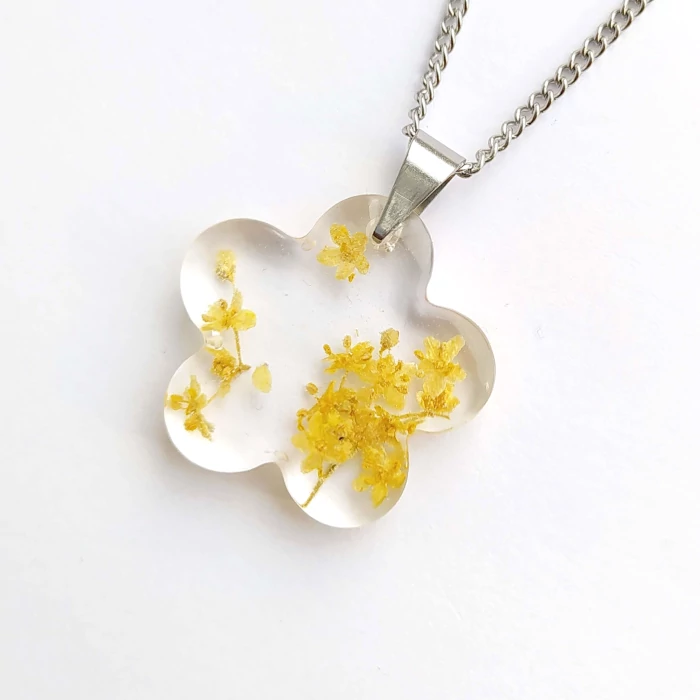Nádherný, jemný a ženský náhrdelník so skutočným kvietkom malej, jemne žltej astry sa hodí do každého výstrihu romantickej ženy.