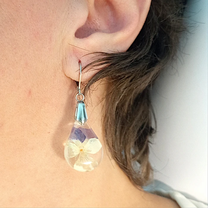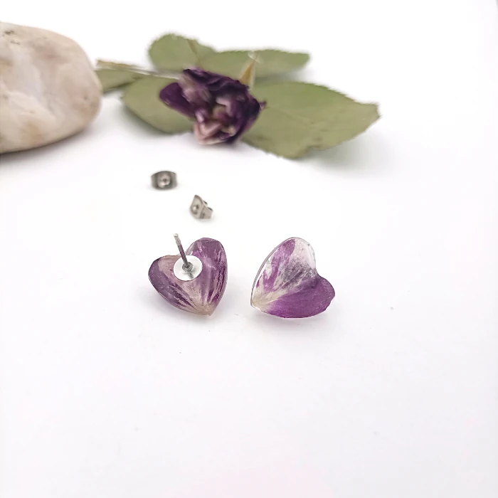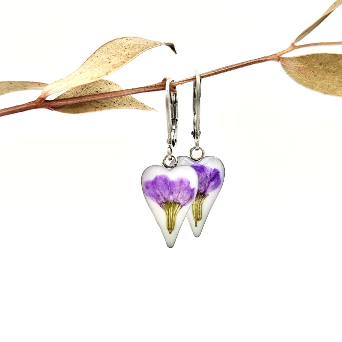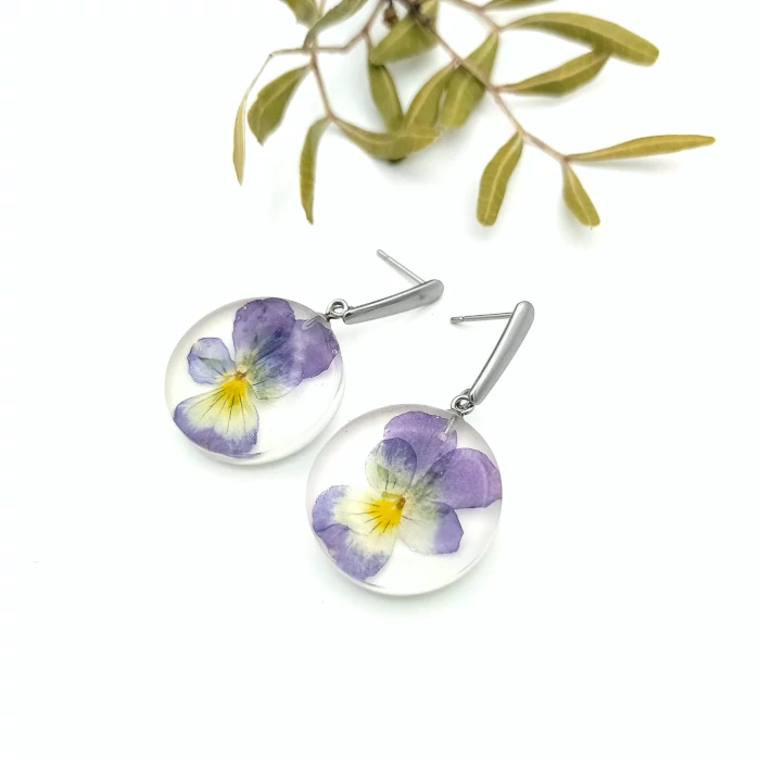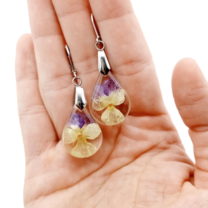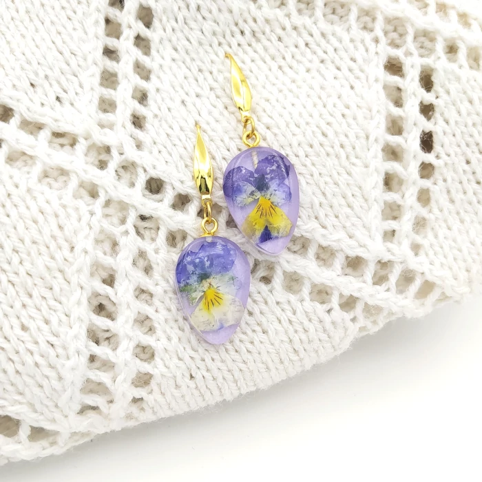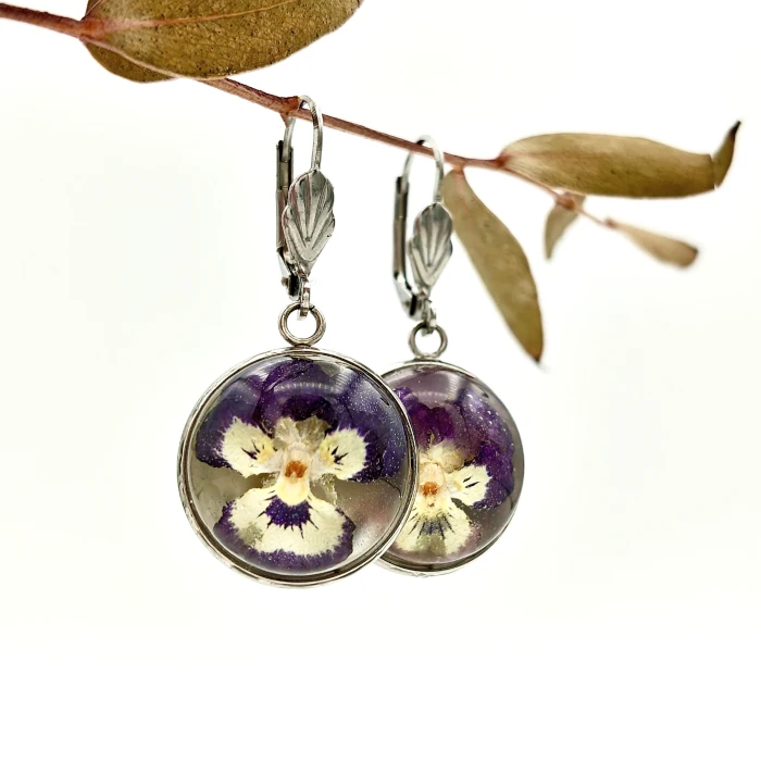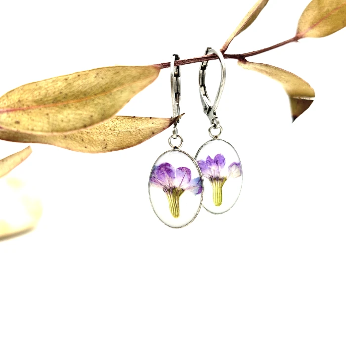 Krásne náušničky, ktoré sú vytvorené z ozajstných fialiek / malých sirôtok, ktoré sú zaliate v živici v lôžkach z chirurgickej ocele na zatváracích ozdobných háčikoch
