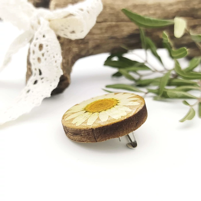 Drevený / živicový prívesok, v ktorom je zaliata margarétka (skutočný kvietok) na drevenom koliesku