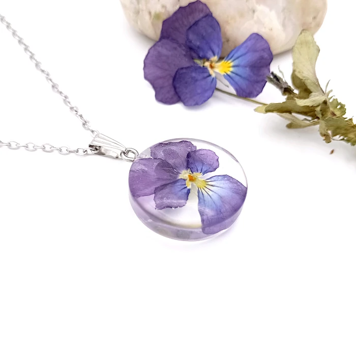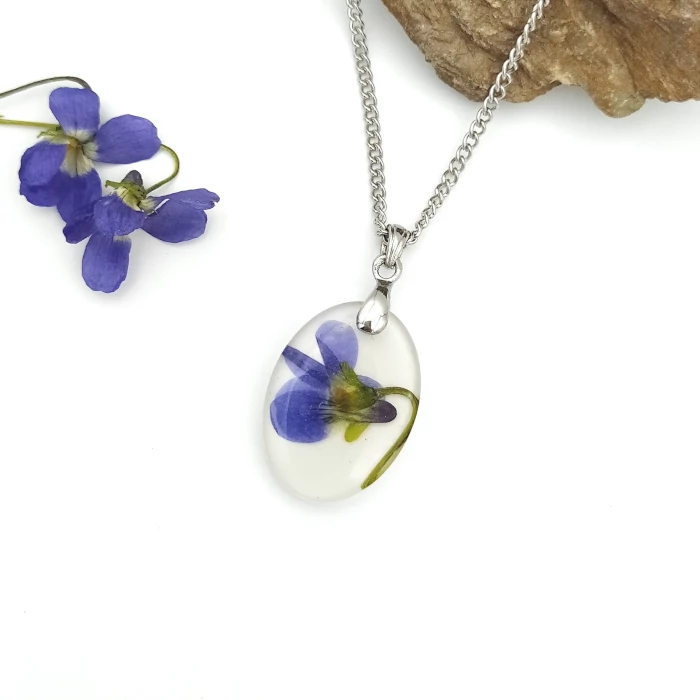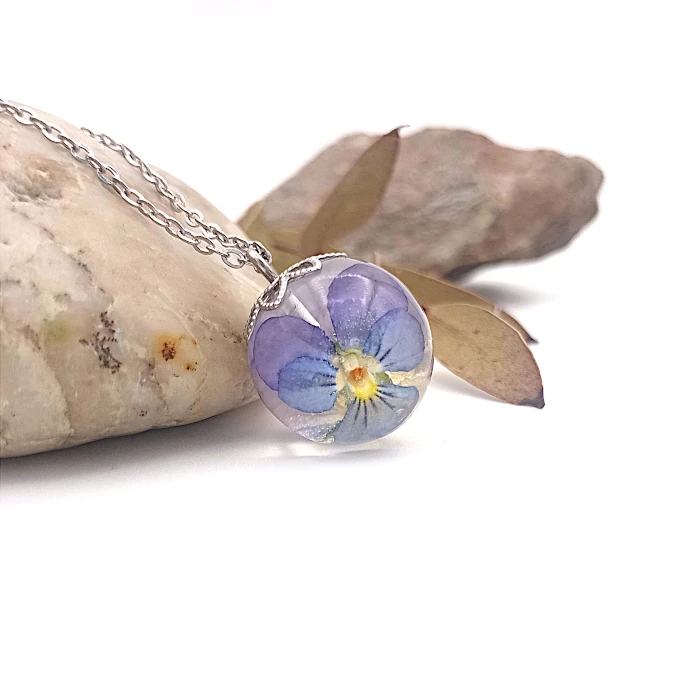 Milý živicový prívesok v tvare menšej guľôčky so skutočnými kvietkami fialky (sirôtky) na retiazke z chirurgickej ocele.