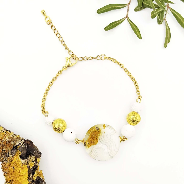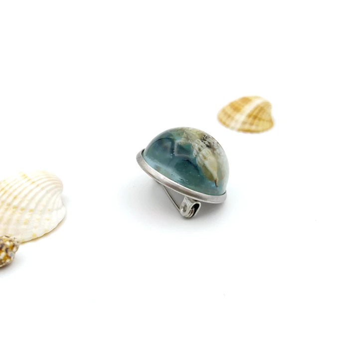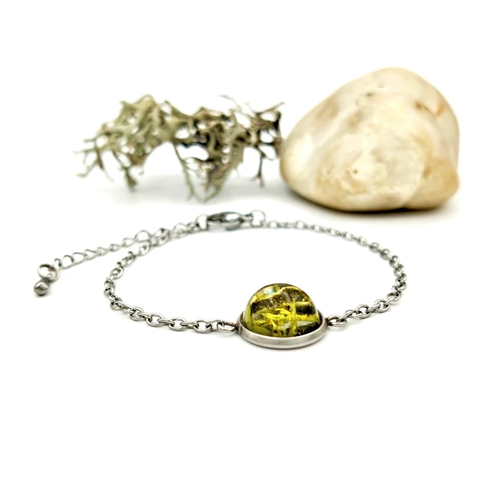 Tento prírodný náramok je vyrobený z ozajstného lišajníka, ktorý je zaliaty v živici, v zaujímavých sivozelených tónoch, kovové komponenty sú z antialergickej ocele.