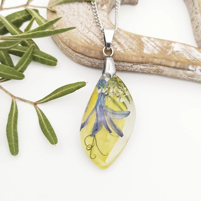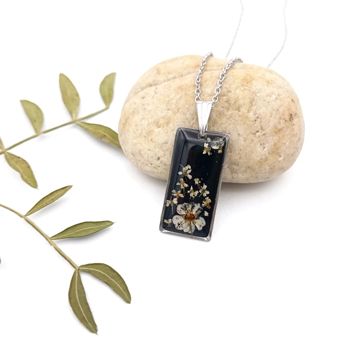 Živicový prívesok s kvietkom bazy čiernej na oceľovej retiazke