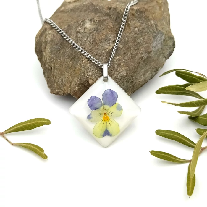 Nádherný, jemný a ženský náhrdelník so skutočným kvietkom fialky / violky /macešky v žltých tónoch sa hodí do každého výstrihu romantickej ženy. Kvietok nie je lisovaný, je ponechaný v 3D tak, ako narástol.