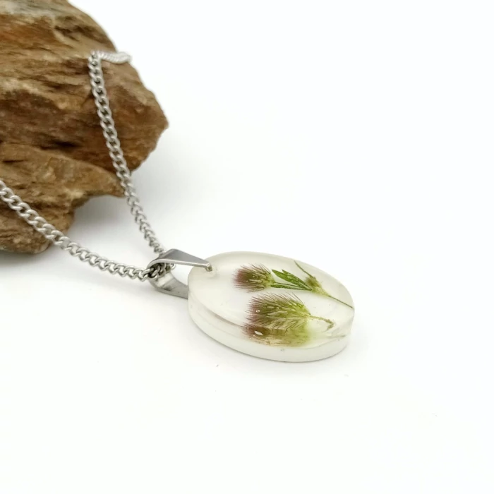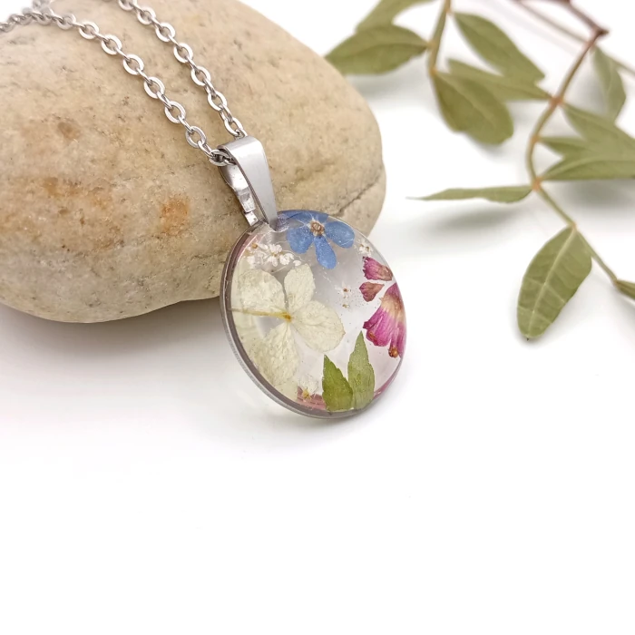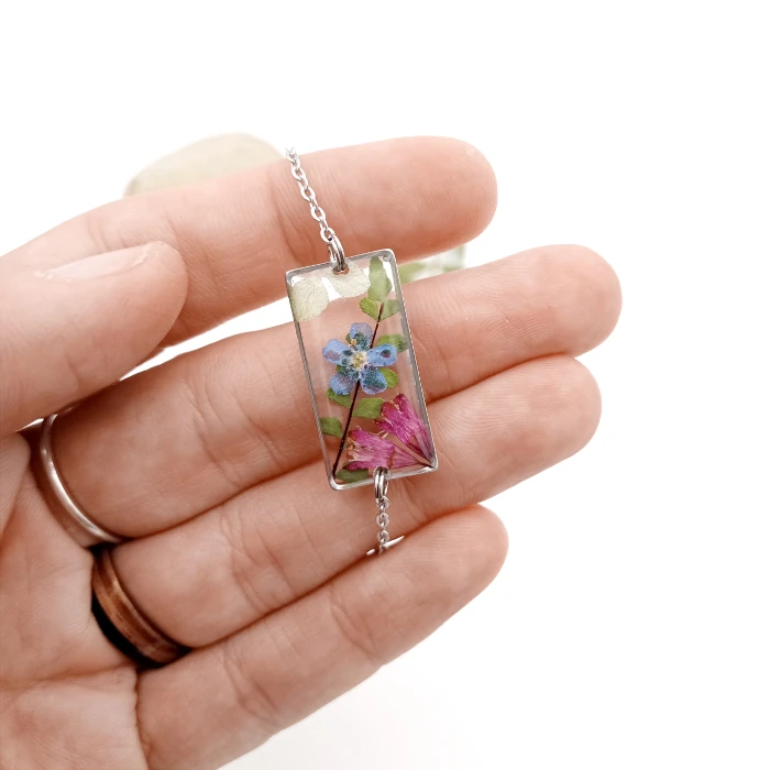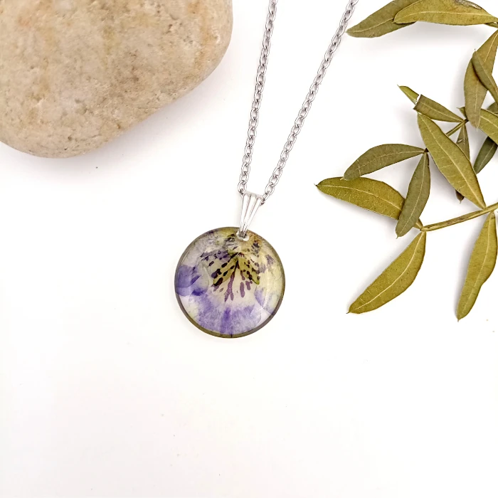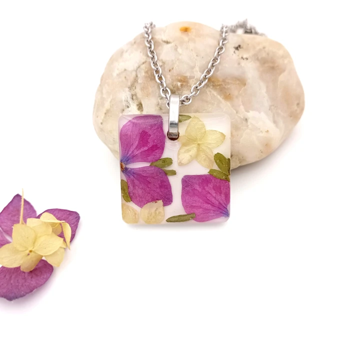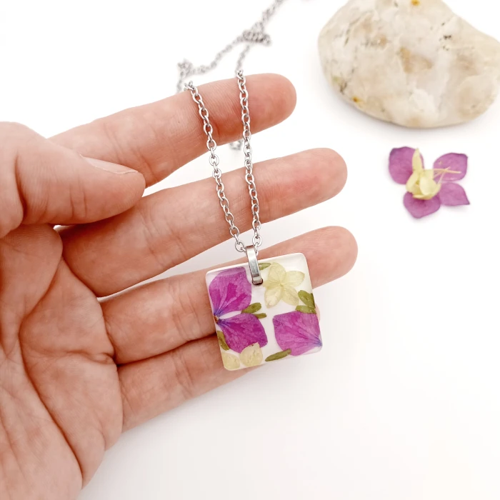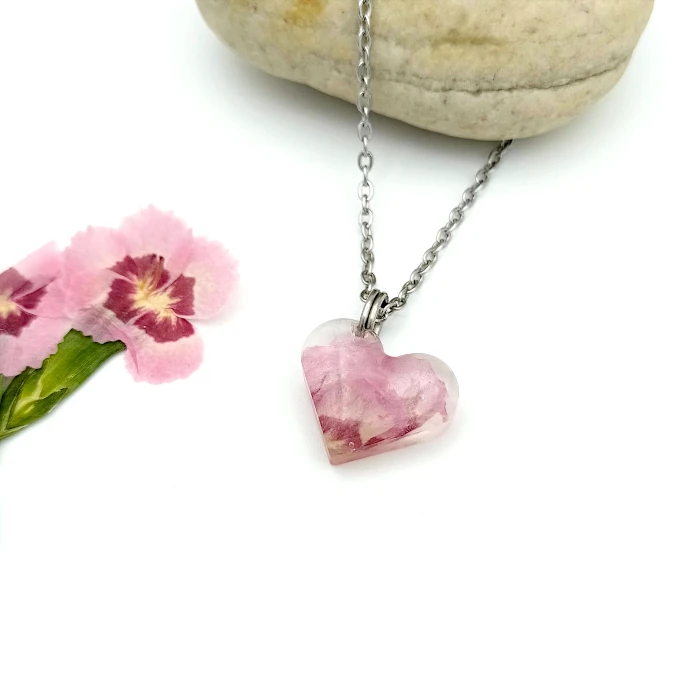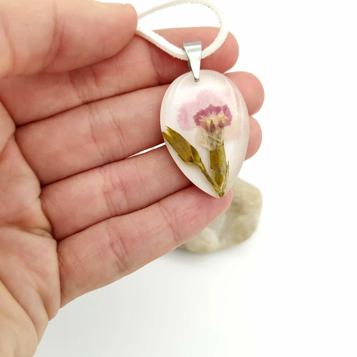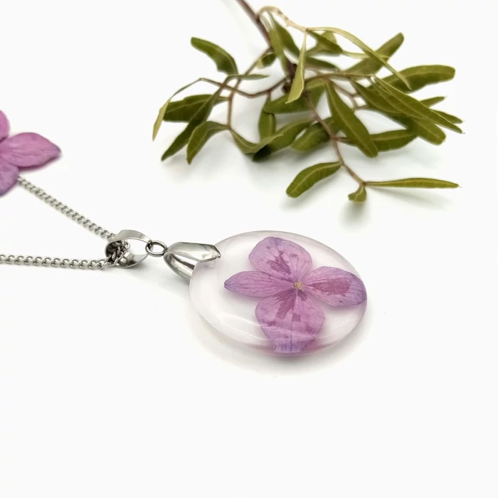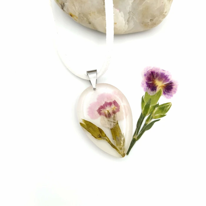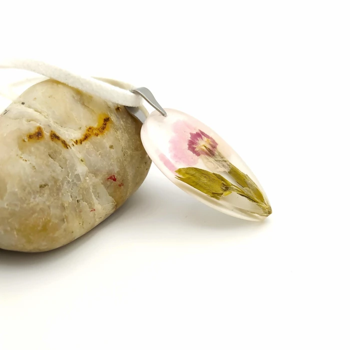 Časť lupeňa ozajstného kvietku, ktorý je zaliaty živicou v oceľovom lôžku v tvare kvetinky, navlečený na tenučkej retiazke. Prívesok je jemnučký, vhodný aj pre mladšie slečny, tiež ženy, ktoré hľadajú niečo zaujímavé, hravé aj elegantné, jednoznačne výnimočné - je to veľmi zaujímavý kúsok v krásnych ružovo-fialkových tónoch