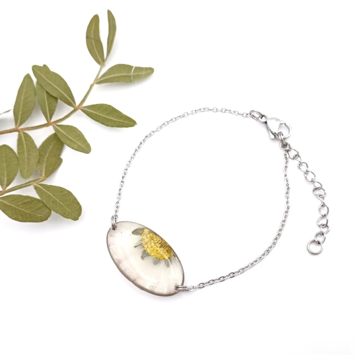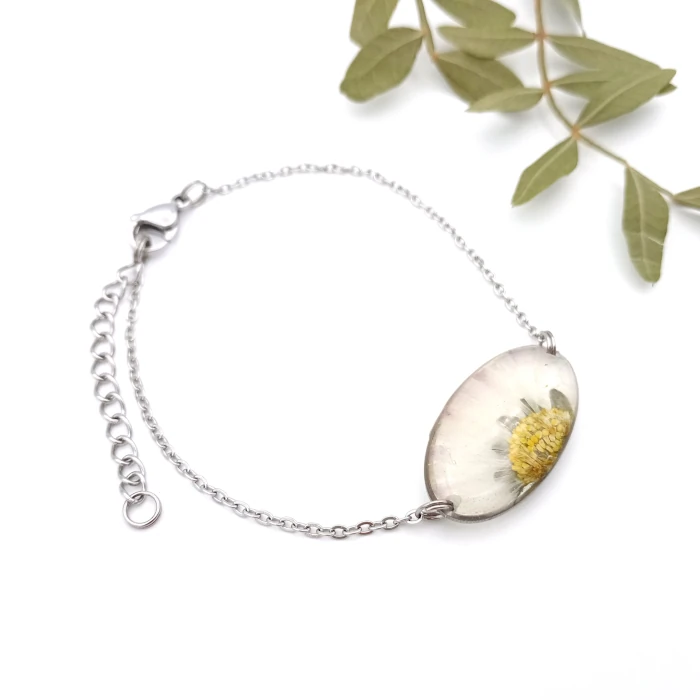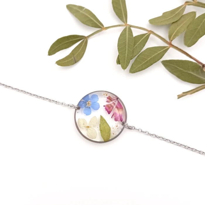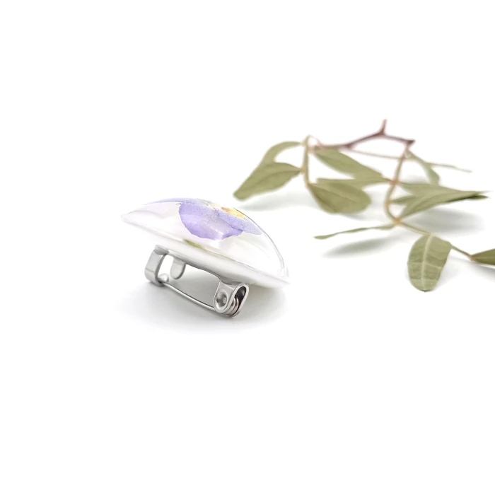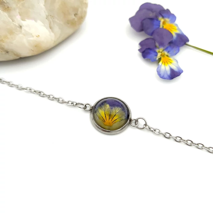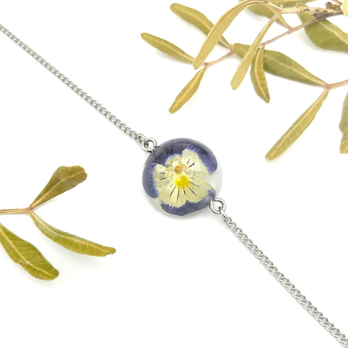 V centre tohto náramku ja v živici zaliaty kvietok drobnej violky (sirôtky / macešky), ktorý pôsobí veľmi jemne, veľmi žensky.