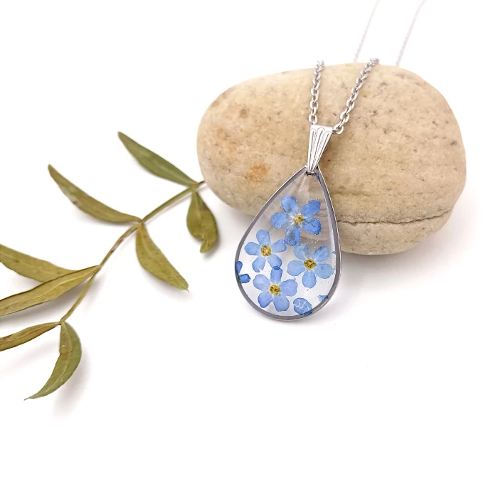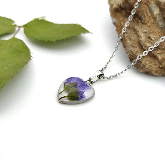 Živicový náhrdelník s ozajstnými kvietkami nezábudky v jemne fialkových tónoch, ktoré sú zaliate živicou v tenkom oceľovom rámčeku v tvare menšieho mesiačika, navlečené na tenučkej retiazke z chirurgickej ocele.