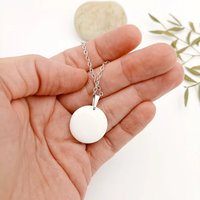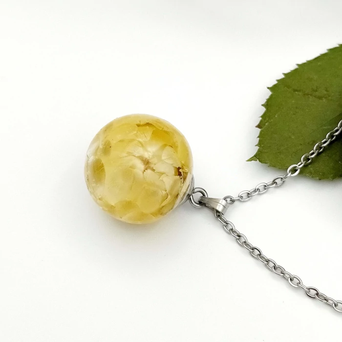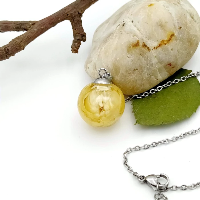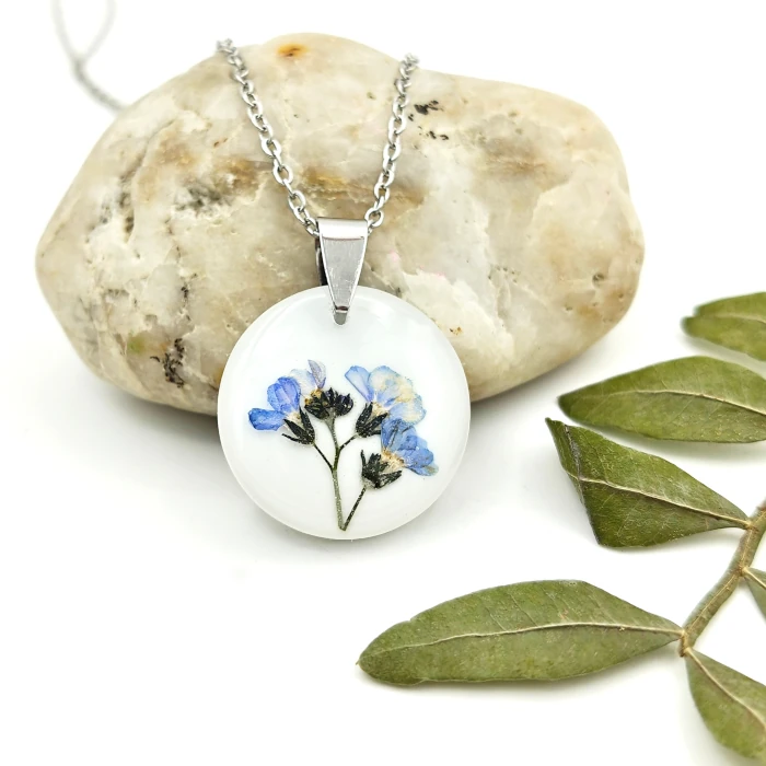 Milý živicový prívesok v tvare menšej guľôčky s kvietkami ozajstnej bielej nezábudky na retiazke z chirurgickej ocele.