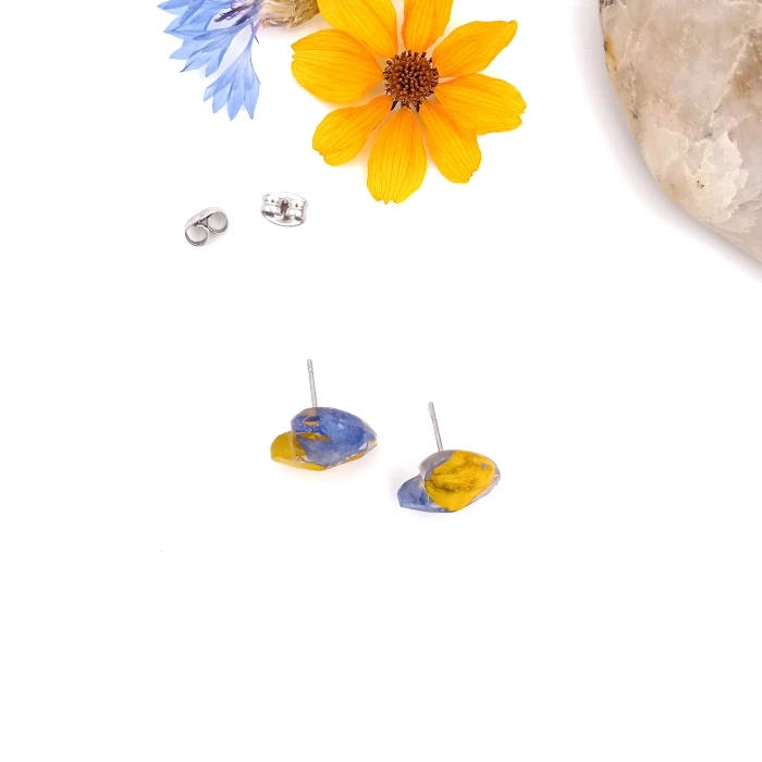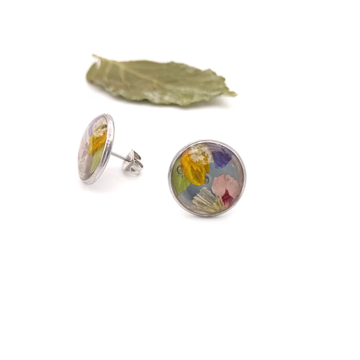 Visiace zatváracie náušnice vznikli z maličkých modrých kvietkov nezábudky, zaliate v oceľových lôžkach (11mm) čírou živicou, pre zvýraznenie farby je vnútro lôžka biele.