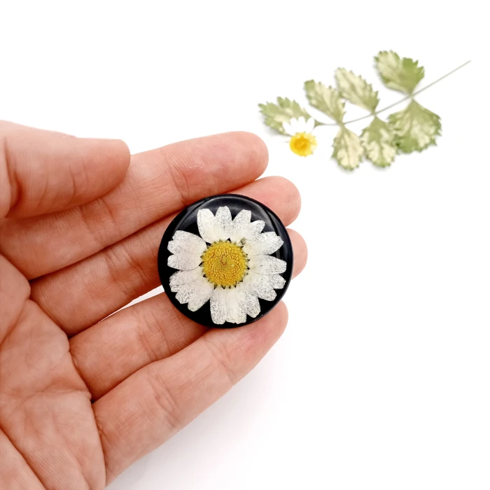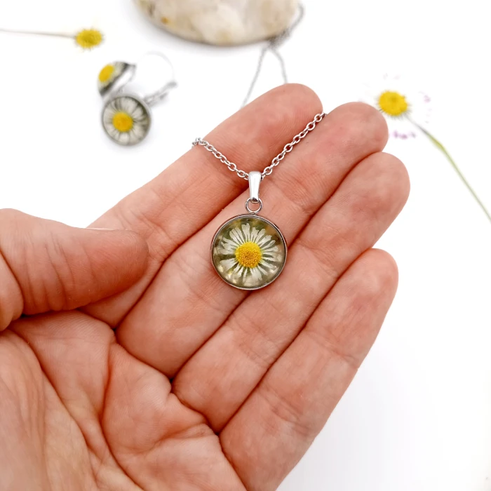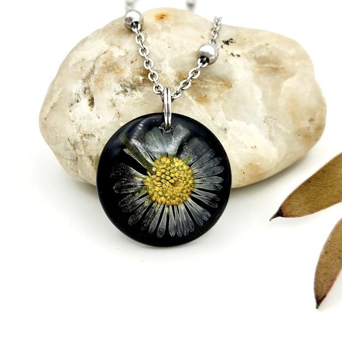 Skvostný jemný prívesok, v ktorom je ozajstný kvietok lisovanej sedmokrásky zaliaty živicou, zo spodnej strany čiernou, čím dostal tento kúsok svoj elegantný a dynamický ráz.
