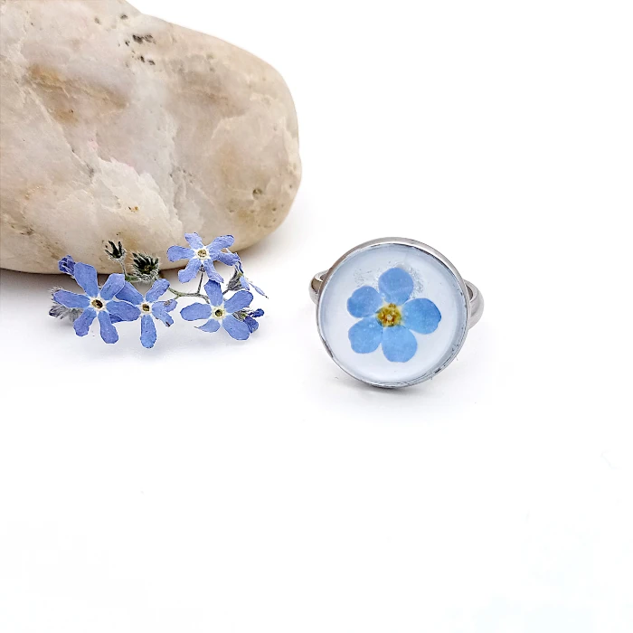 Z drobnej modrej nezábudky a tiež vďaka zaujímavej obrúčke vznikol tento krásny prstienok