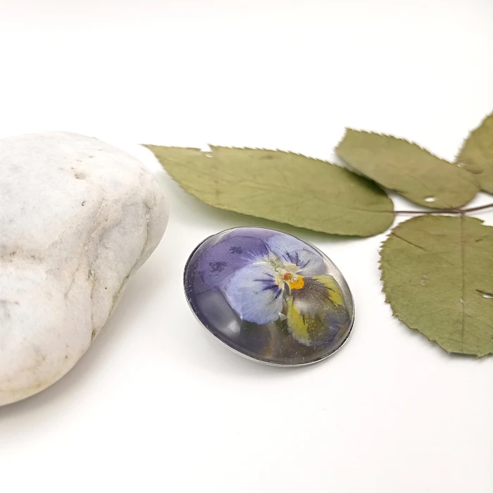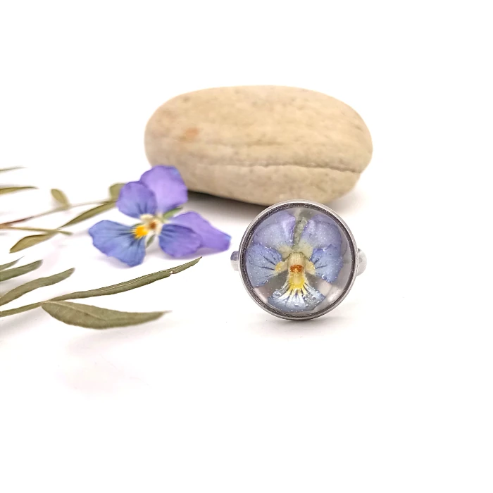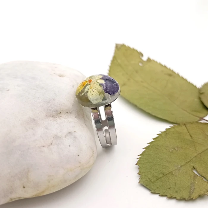 Na obrúčke z chirurgickej ocele je v živici zaliata skutočná fialka