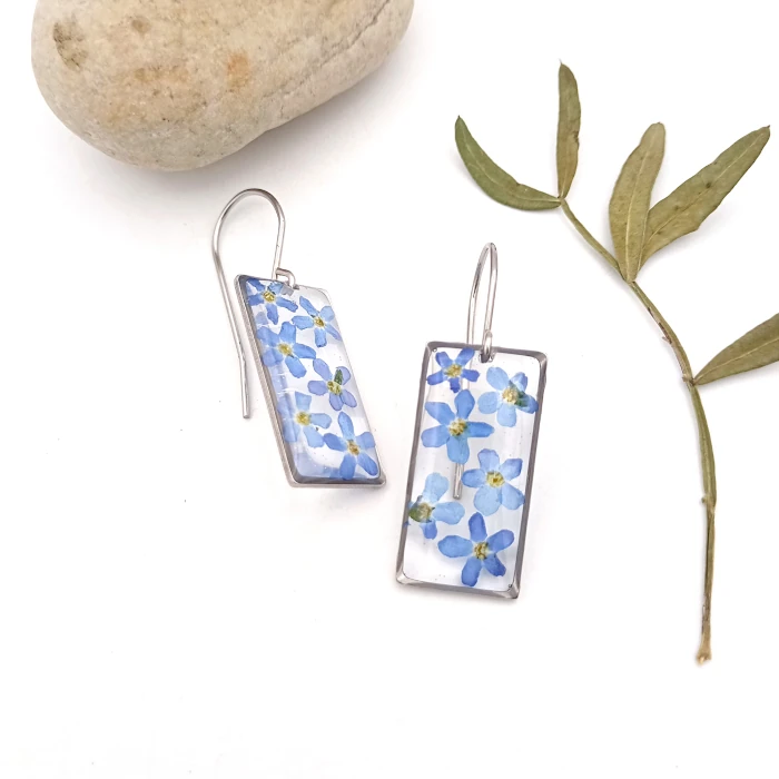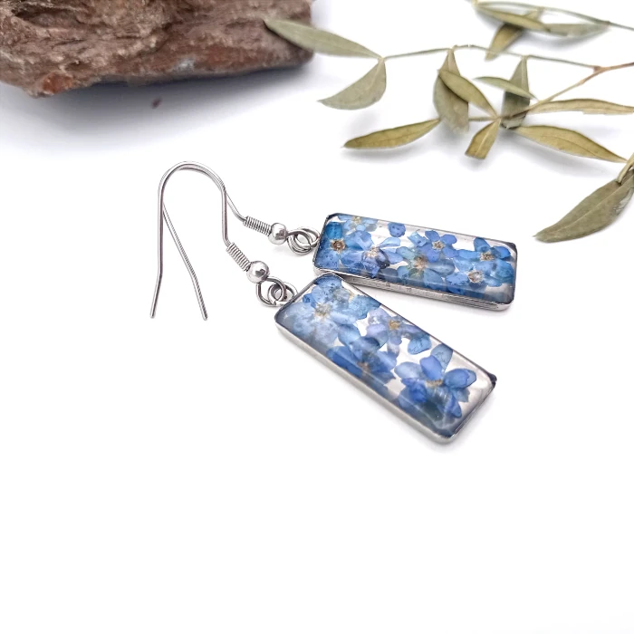 Živicové visiace náušnice s krásnymi sušenými nezábudkami v modrých aj bielych farbách.