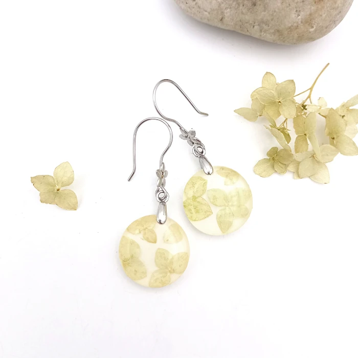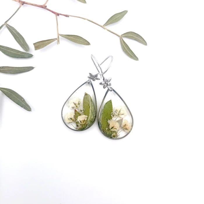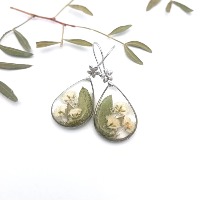 Visiace náušnice so zaliatymi skutočnými kvietkami ďateliny v živici