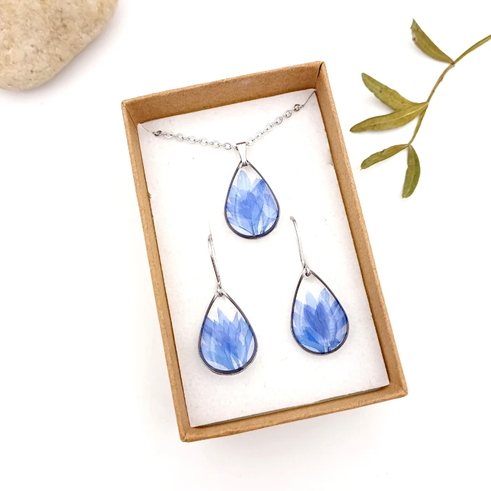 Náušnice a náhrdelník, ktoré vznikli zaliatim malých kvietkov nezábudiek v jemne modrých až fialkových tónoch.