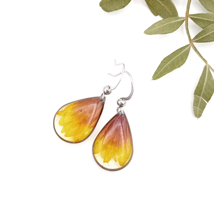 Krásne visiace náušnice s lupienkami skutočného kvietku kokardy v tenkých oceľových rámikoch v tvare slzičky na zatváracích háčikoch z ocele. Majú krásne farby, od žltej až po červenohnedú.