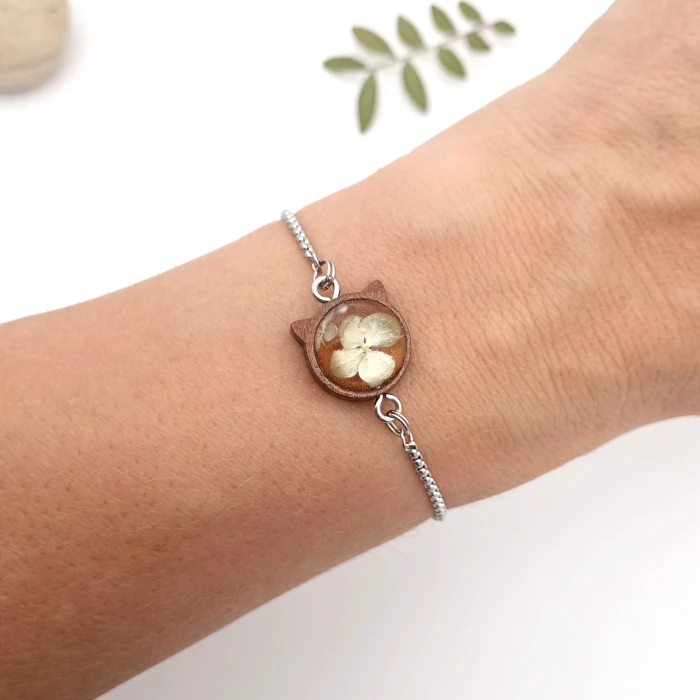 Kvet tavoľníka zaliaty živicou v drevenom tmavohnedom koliesku (v tvare mačičky) sa stane určite výnimočným kúskom na vašu ruku.
