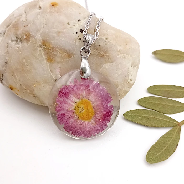 Jemný kvietok sedmokrásky s lupienkami sfarbených až do tmavo-ružových tónov, zaliaty čírou živicou v tenkom oceľovom rámčeku, navlečený na tenučkú retiazku s karabínkou.