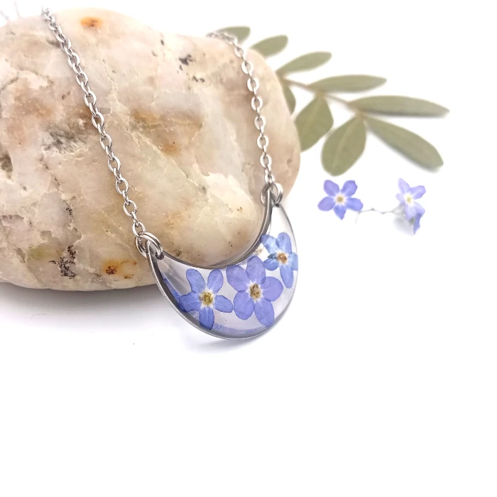 Živicový náhrdelník v tvare mesiačika so skutočnými nezábudkami