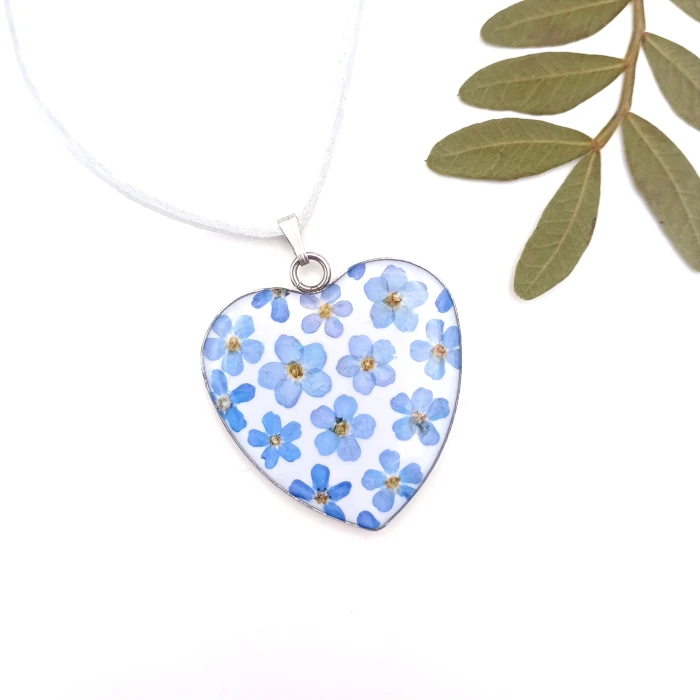 Krásne drobné kvietky nezábudky, zaliate v prívesku zo živice v tvare väčšieho srdiečka (lôžko z chirurgickej ocele), navlečené na koženú šnúrku