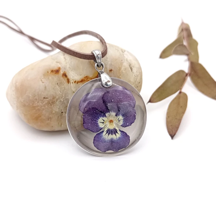 Krásna fialka (violka, maceška) zaliata vo väčšom prívesku zo živice, je prekrásne sfarbená, navlečená na koženú šnúrku, ktorej dĺžku si upravíte podľa želania, očko je z chirurgickej ocele.