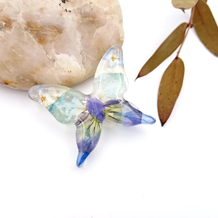 Živicová brošňa zo skutočných kvetov a lupienkov kvetov v modrých tónoch