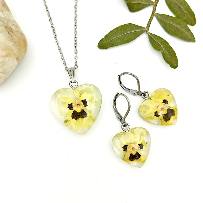Krásna súprava šperkov, ktorá vznikla zo skutočných fialiek (žlté sirôtky), ktoré som s láskou pozbierala, dôkladne vysušila (nie sú lisované) a napokon zaliala do živice, do srdiečkových tvarov.