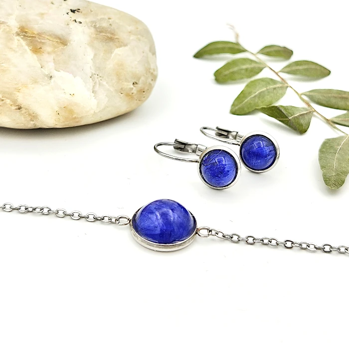 Spojenie ocele a krásnych modrých tónov lupienkov skutočnej nevädze dali vzniknúť tejto súprave šperkov - náušniciam s náramkom.
